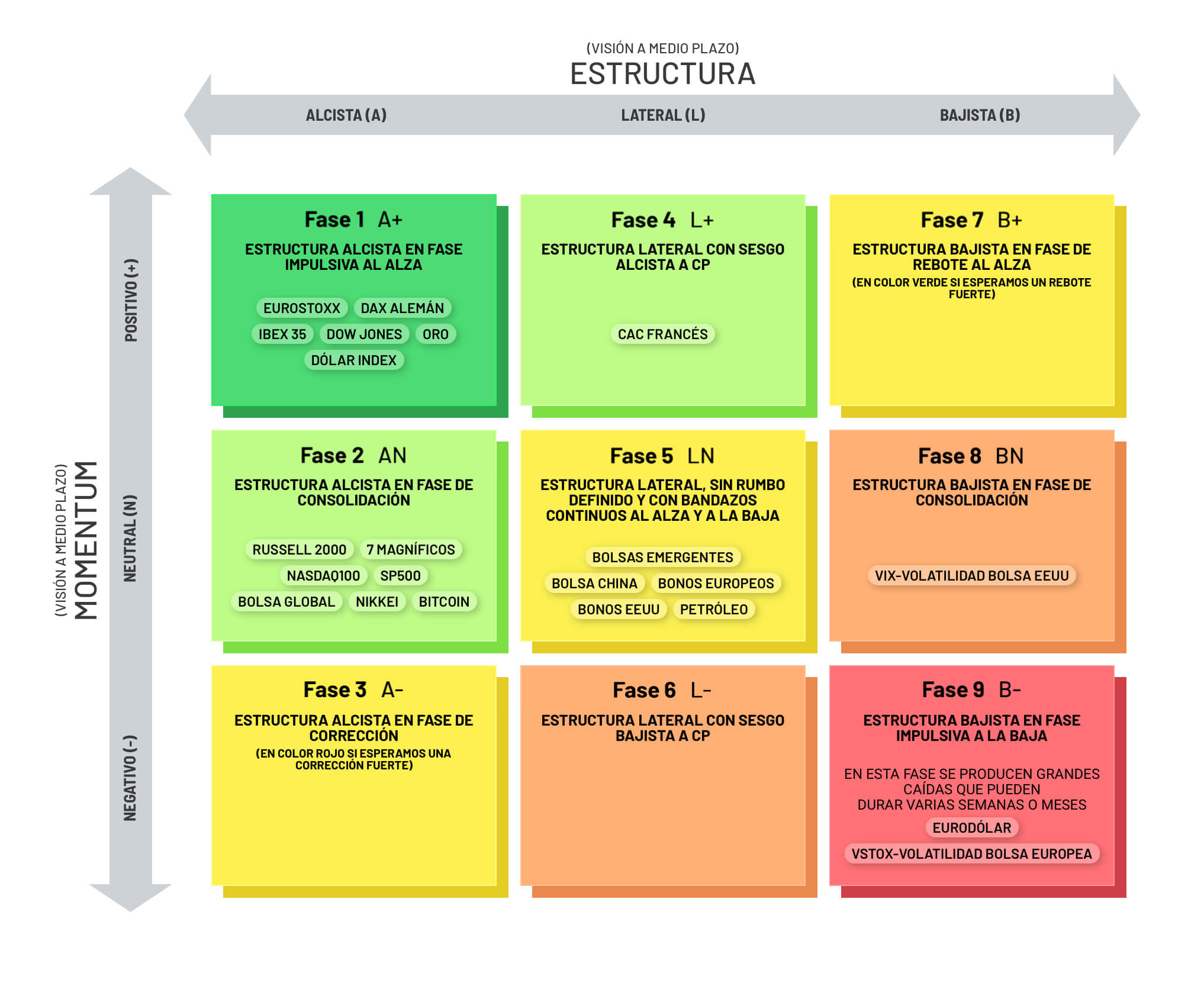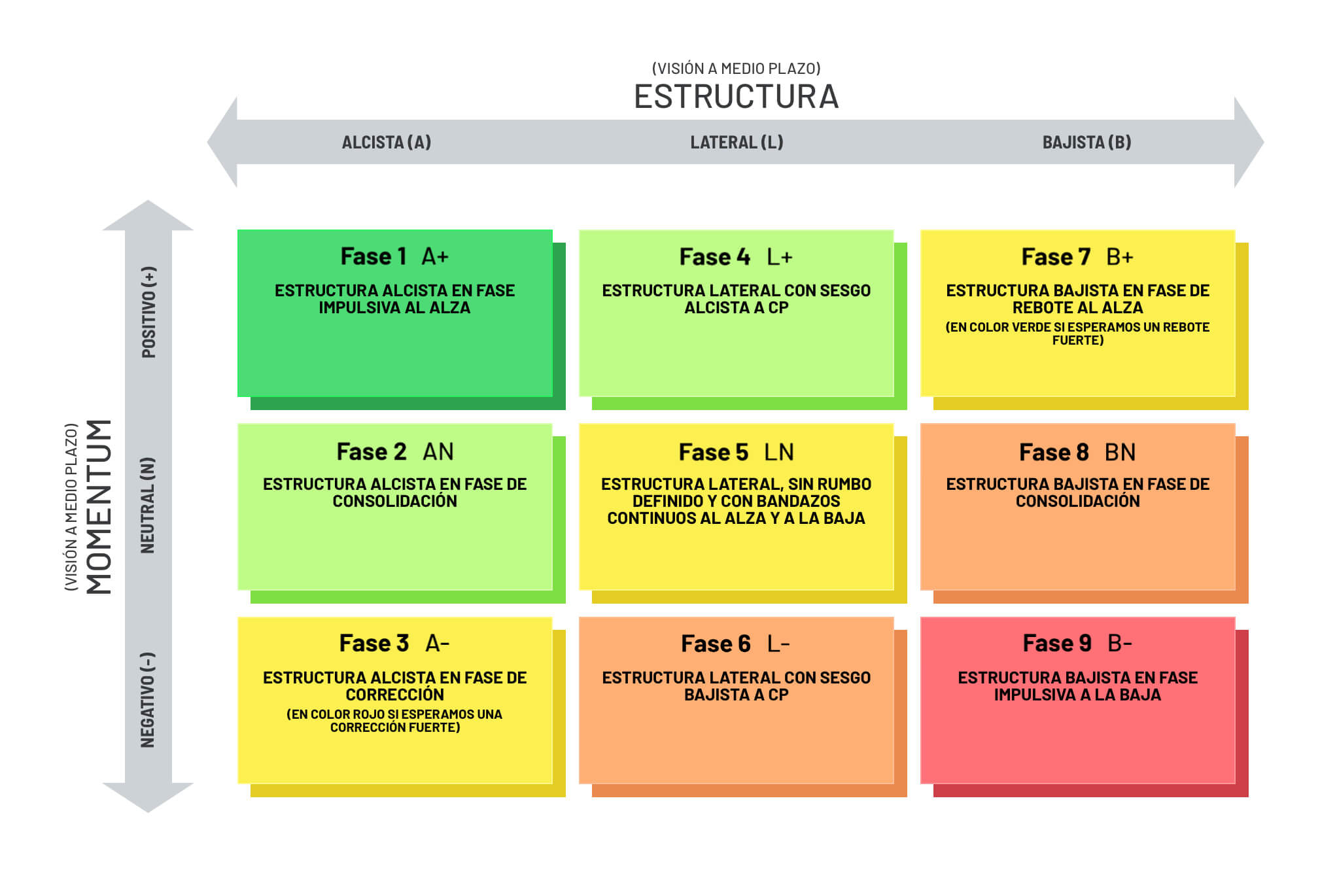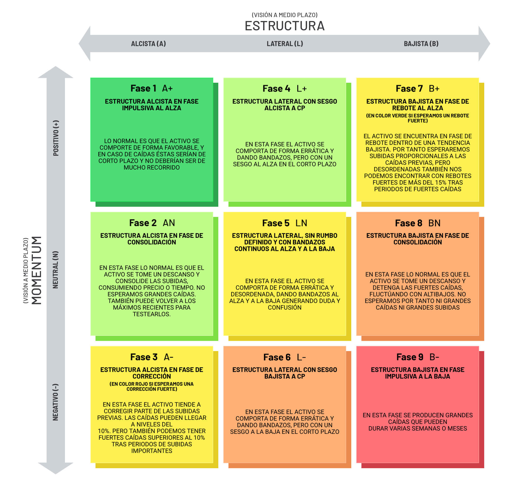 Al combinar la estructura (tendencia general) con el momentum (fase actual dentro de la tendencia), obtenemos 9 escenarios o fases de mercado:
